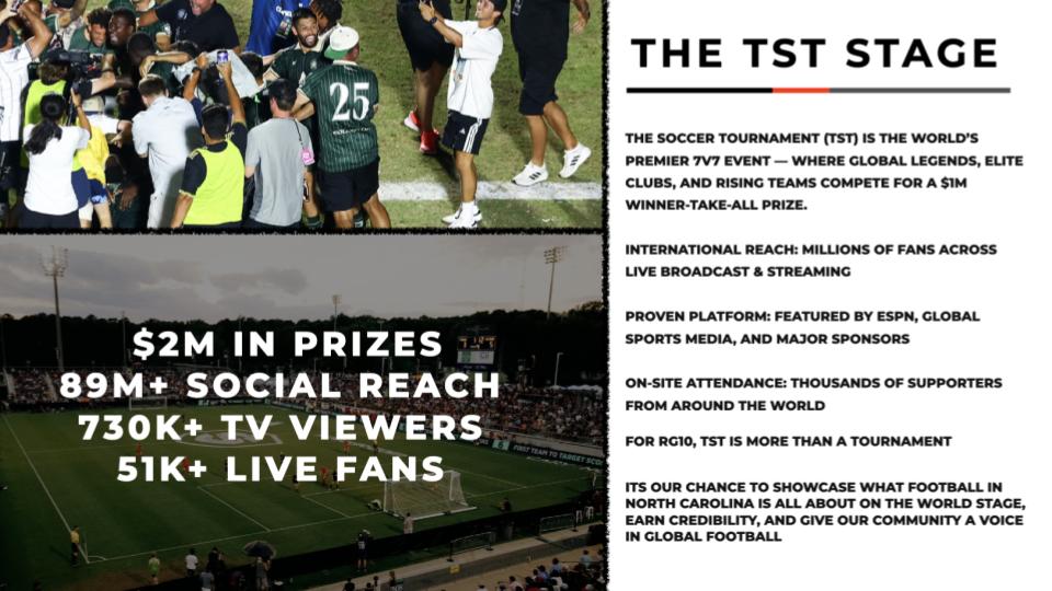 RG10 Football is officially competing in The Soccer Tournament (TST) 2026 — the world’s premier 7v7 event with a $1M prize, global broadcast, and millions of fans worldwide .